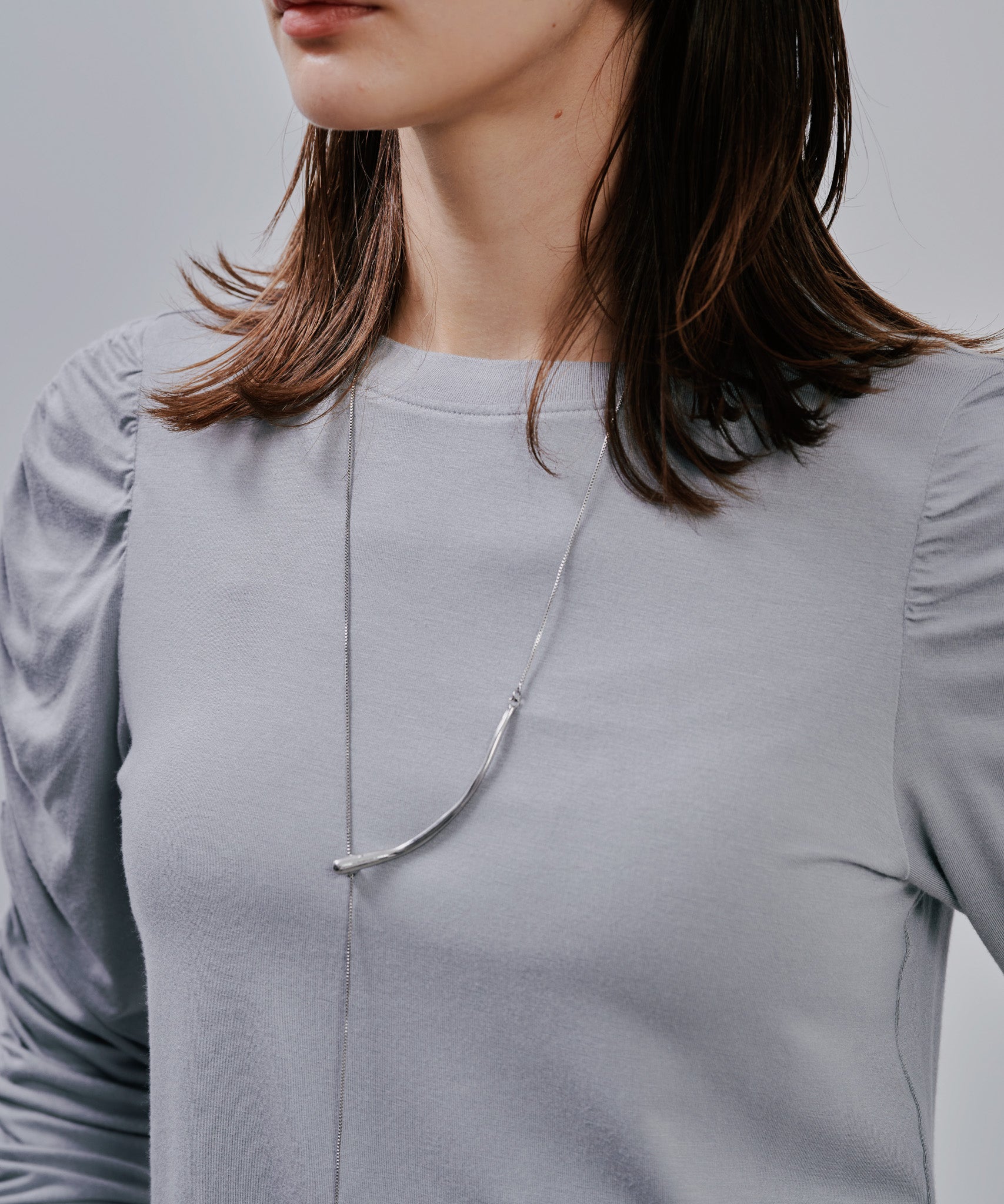 体のラインを拾いすぎない程良いフィット感のシルエット。インナーとしても一枚としてとしてもスマートに着こなせます。
