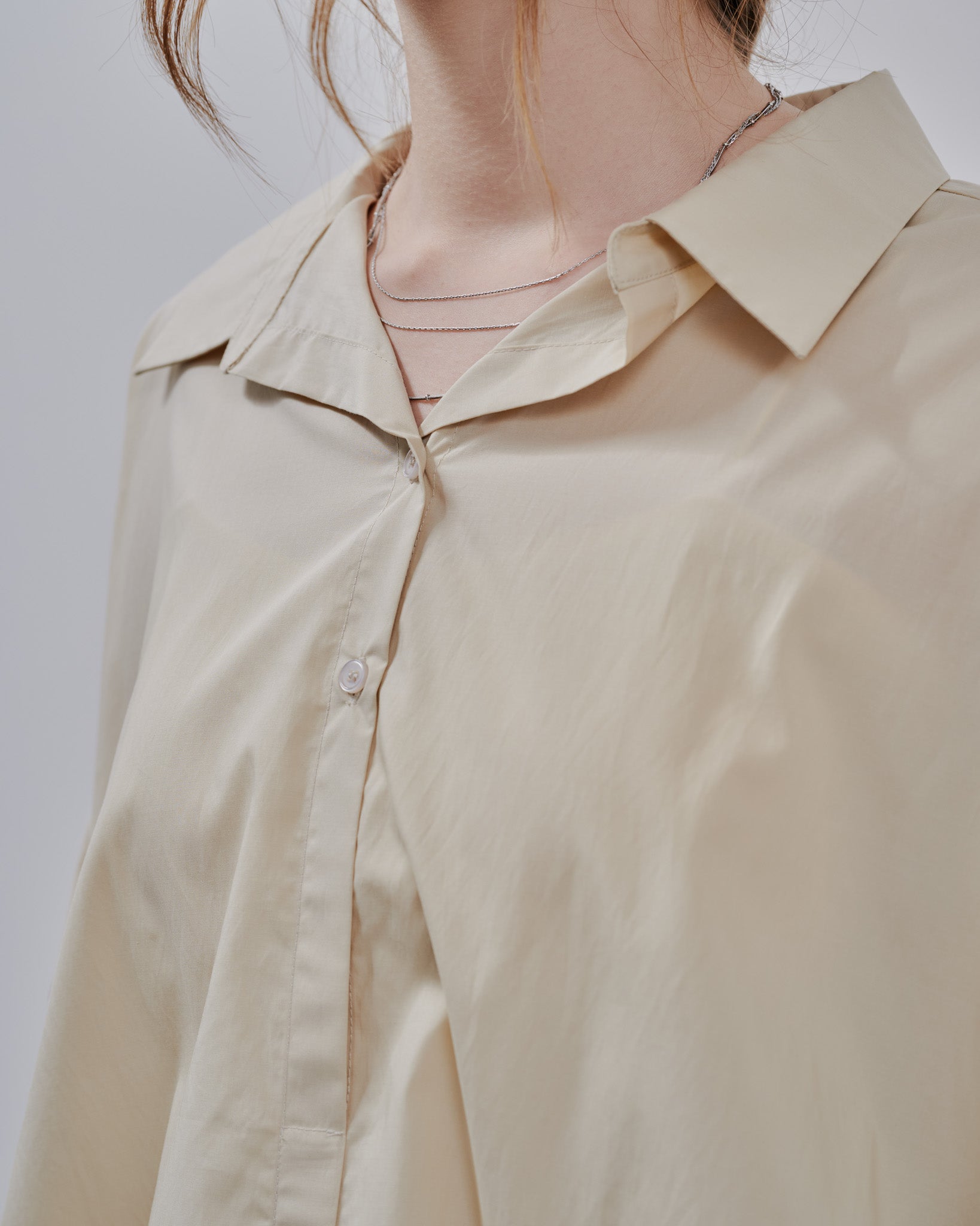 ハリ感のある綿混ブロード素材を使用。シーズンを問わず着用しやすい、軽やかで肌触りの良いシャツ素材を使用。