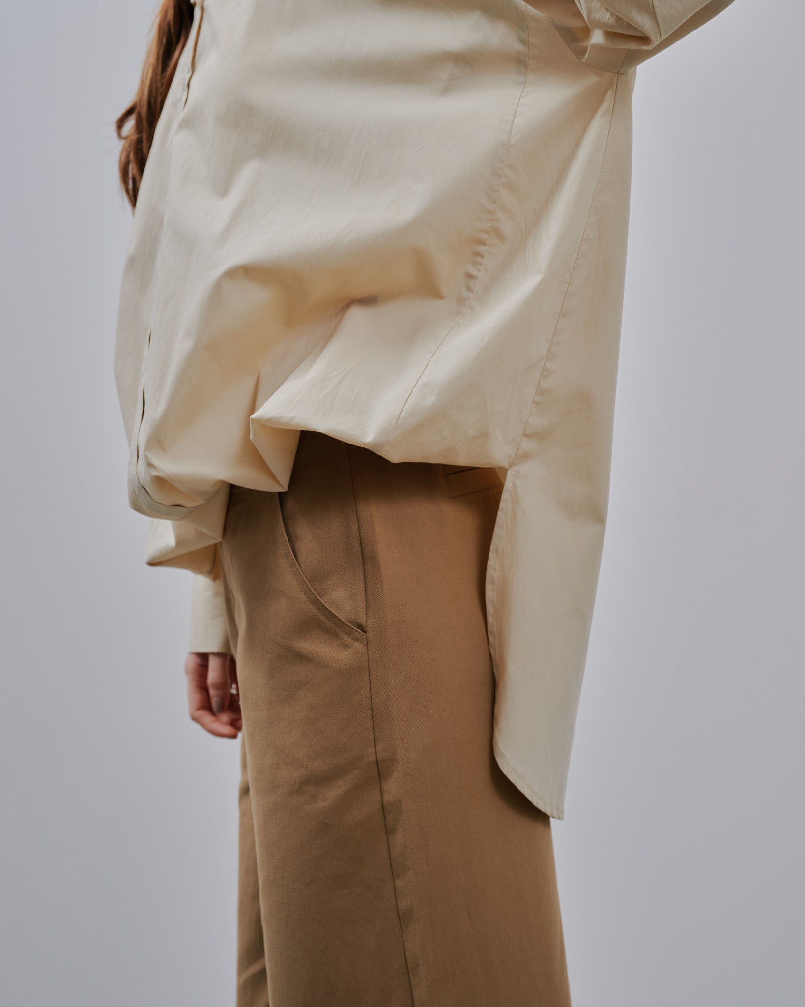長めの袖が自然にブラウジングされ、カフスの幅がエレガントなボリュームを演出。 裾に配備したベルトを中に付属されたボタンにつけることによって、バルーンシルエットが実現されます。