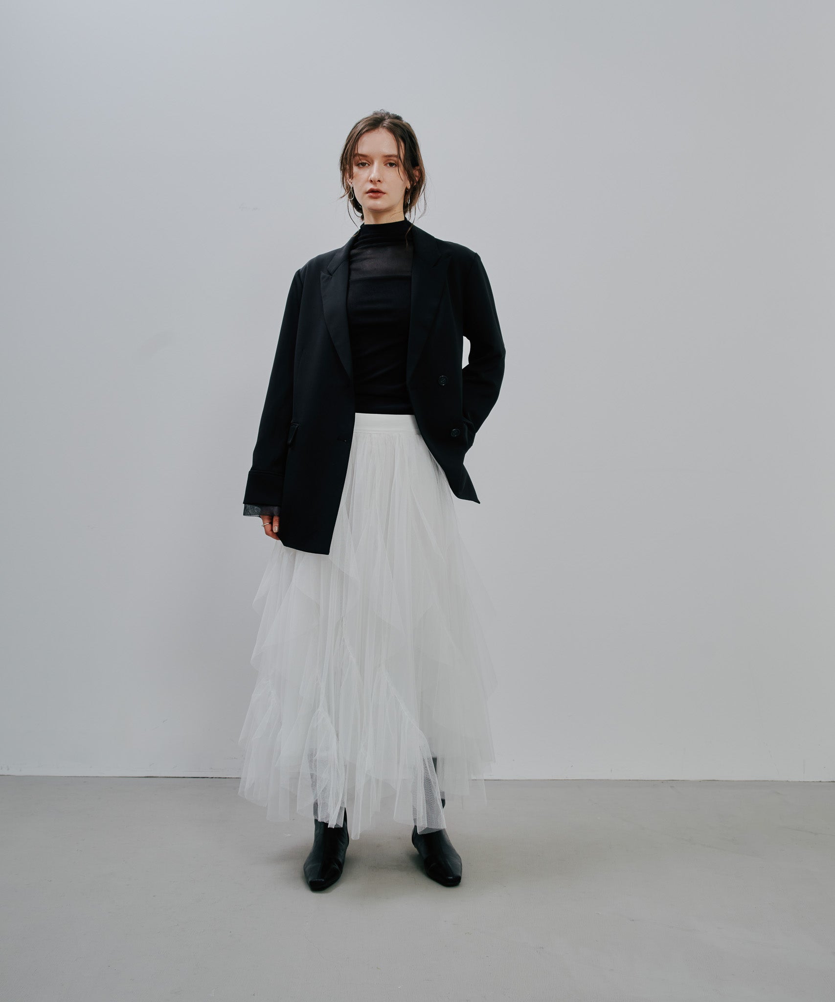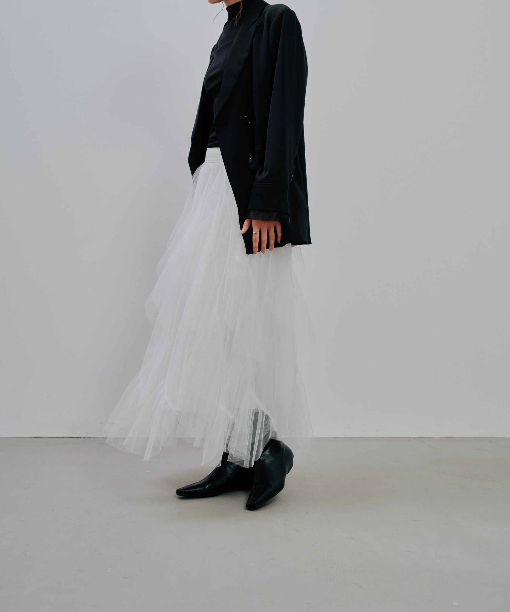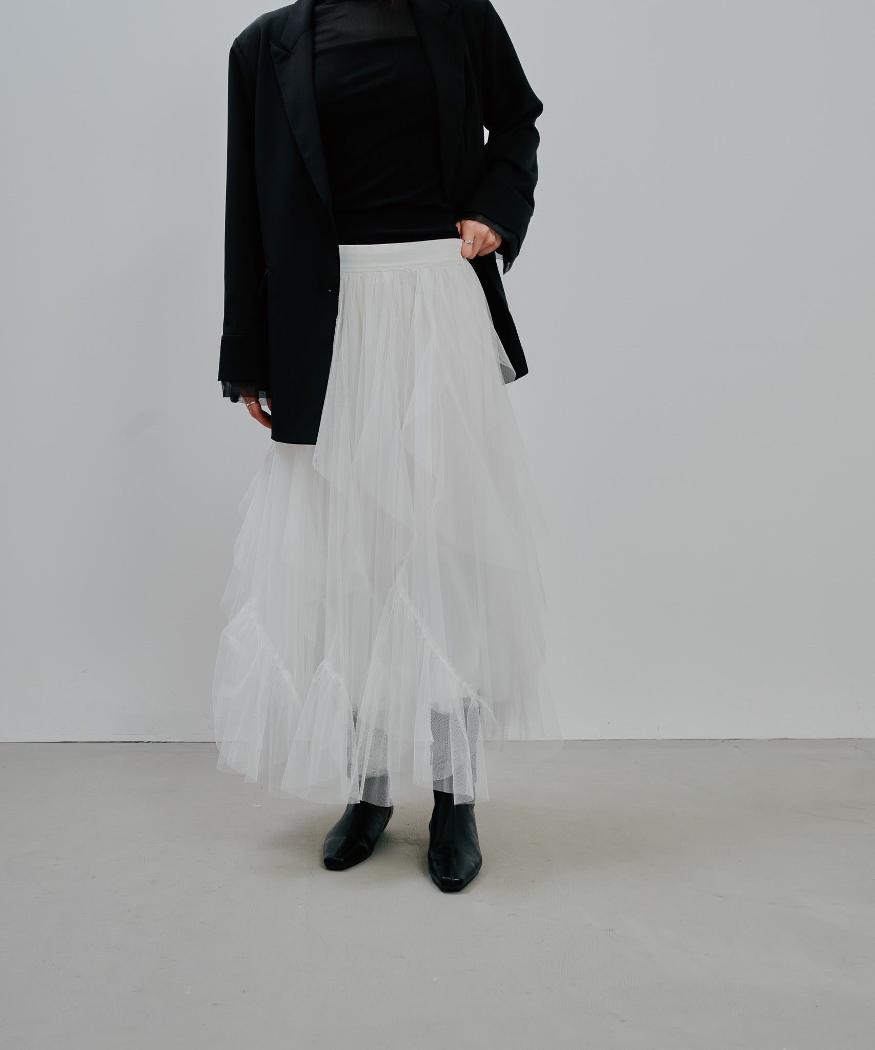 ティアードの位置やフリル幅、ギャザーの分量にこだわり、甘さを抑えつつも存在感のある理想的なシルエットに。