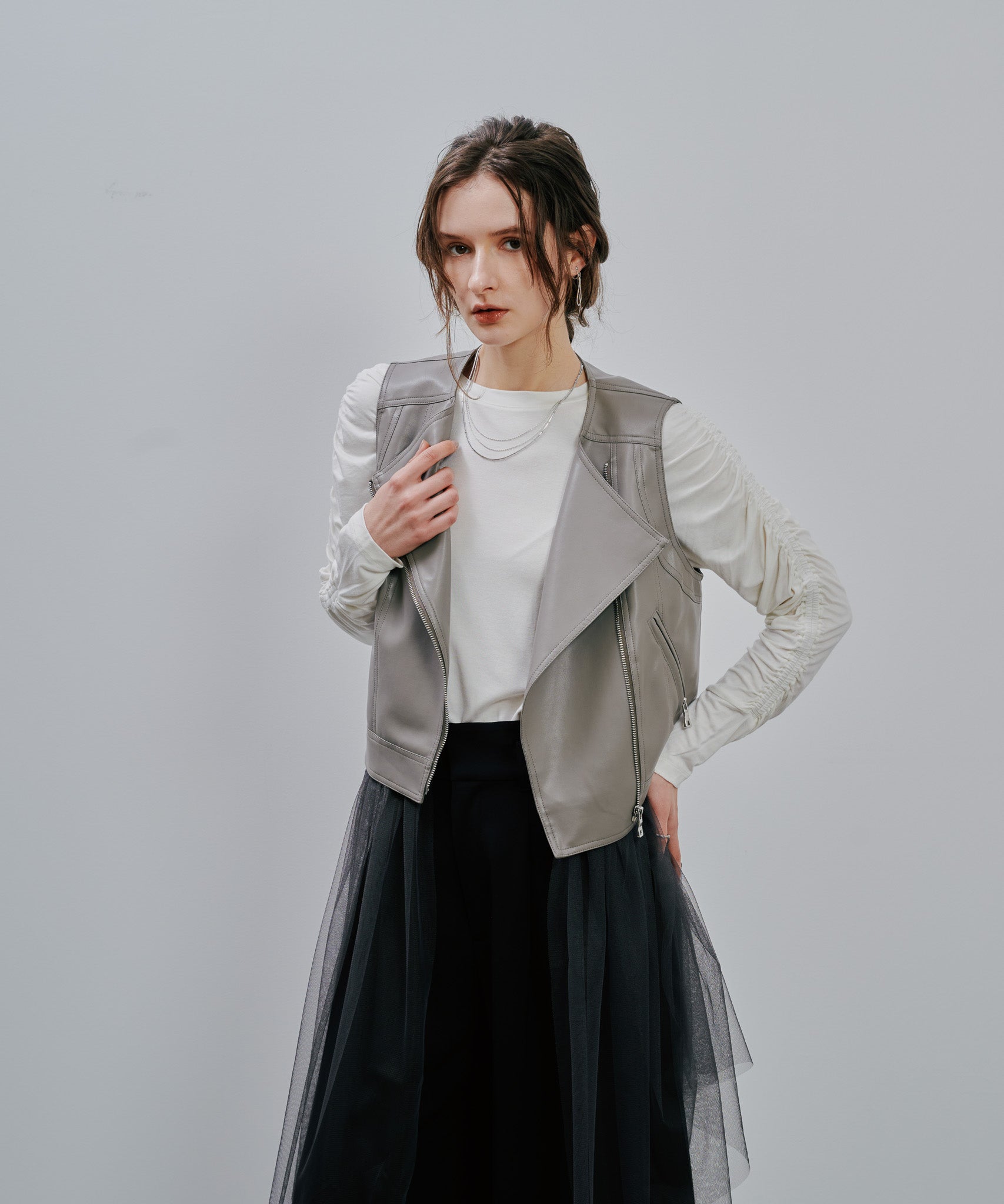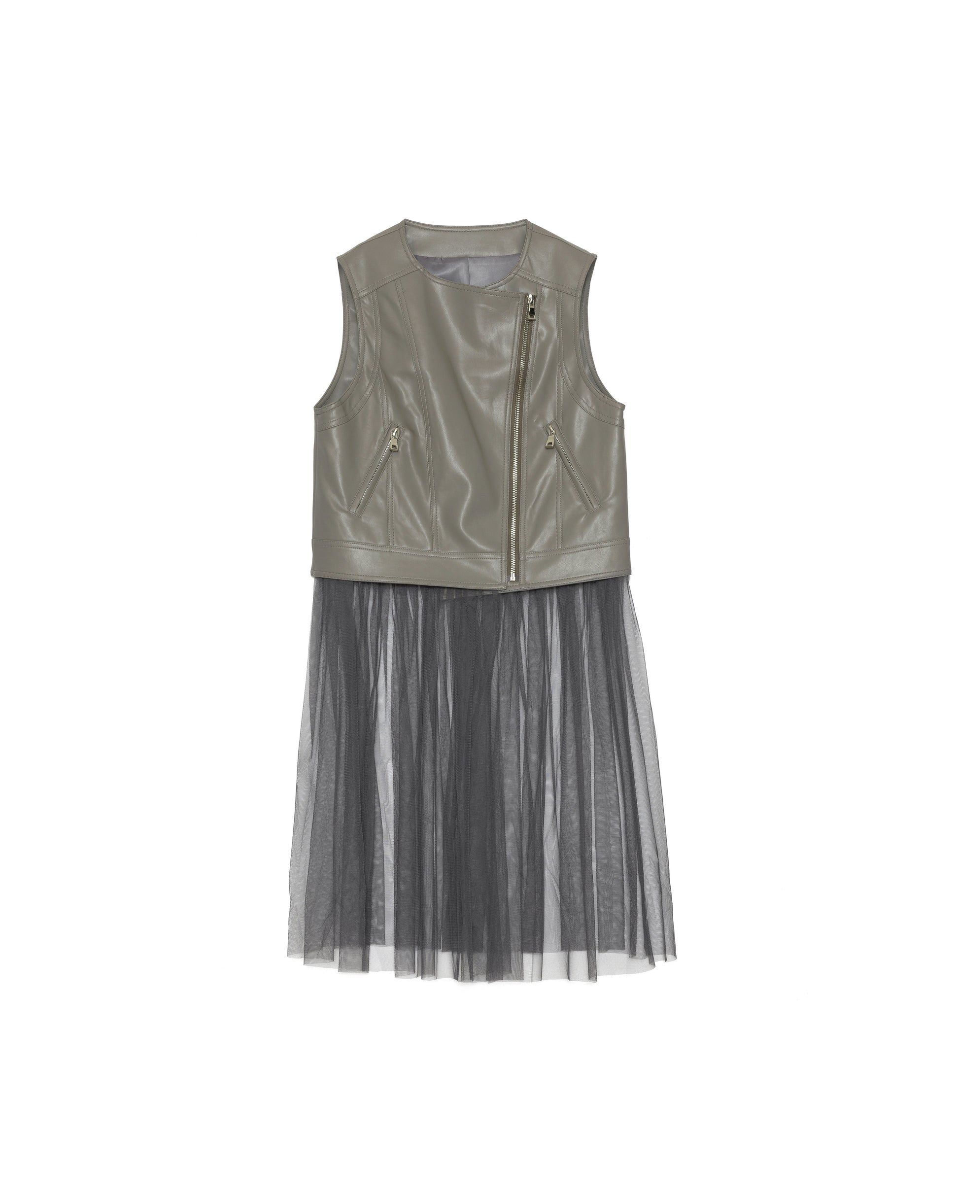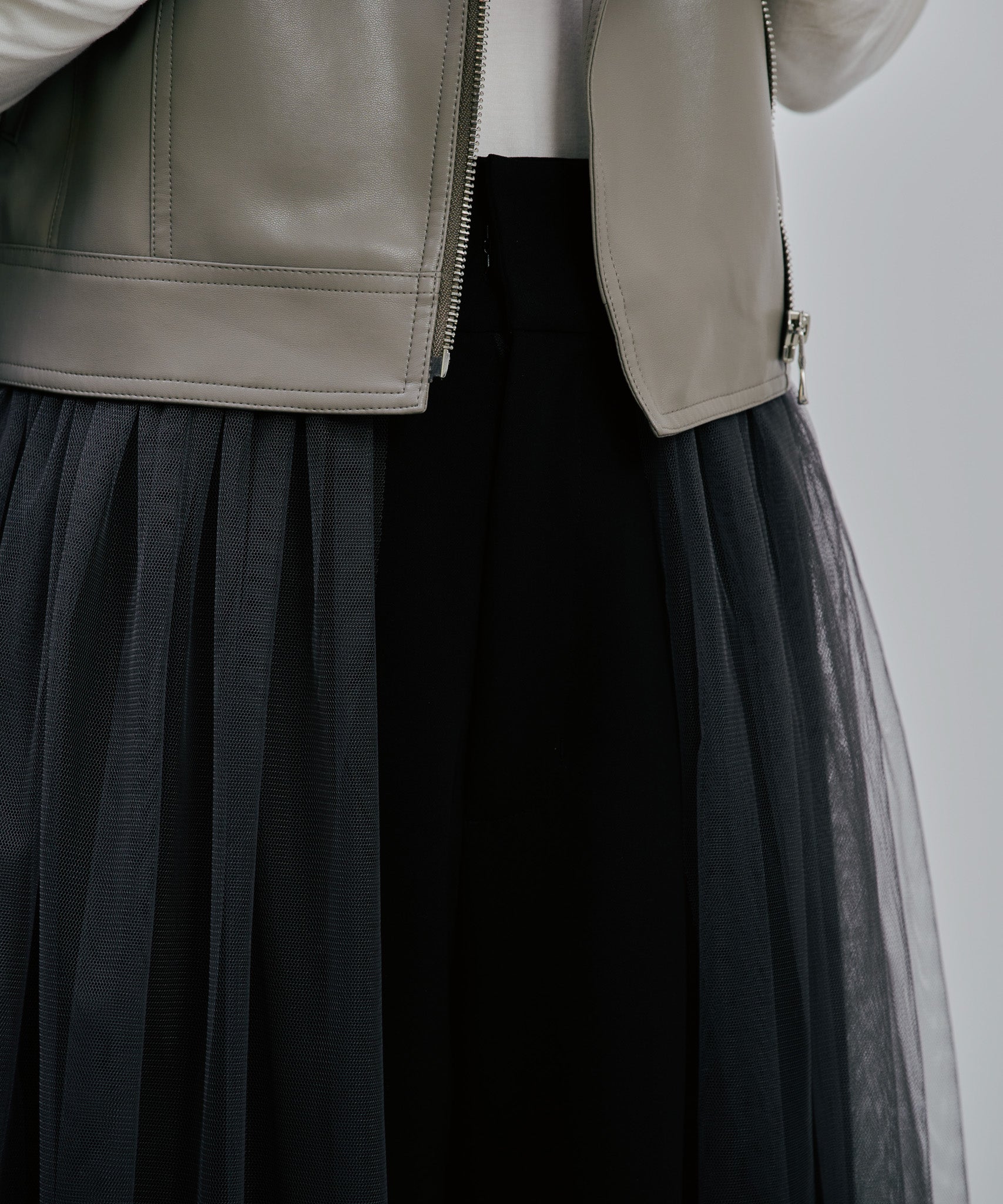 無骨なフェイクレザーに広がるチュールの組み合わせが甘さとモード感を両立させ、着るだけでドラマティックな装いに。ボトムスを変化することに見え方が変わるチュールのレイヤードも◎