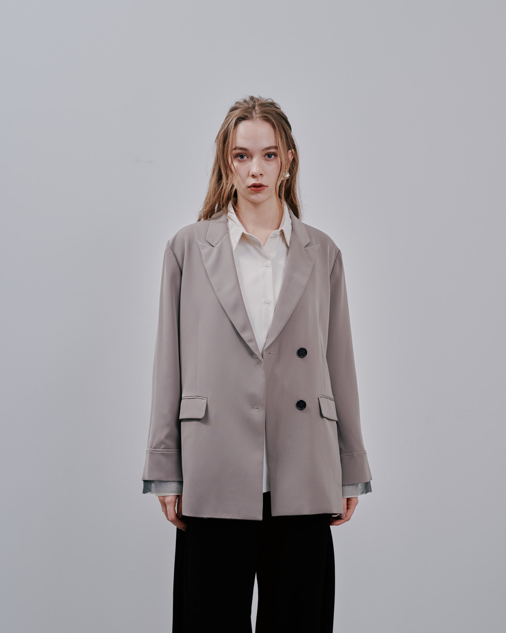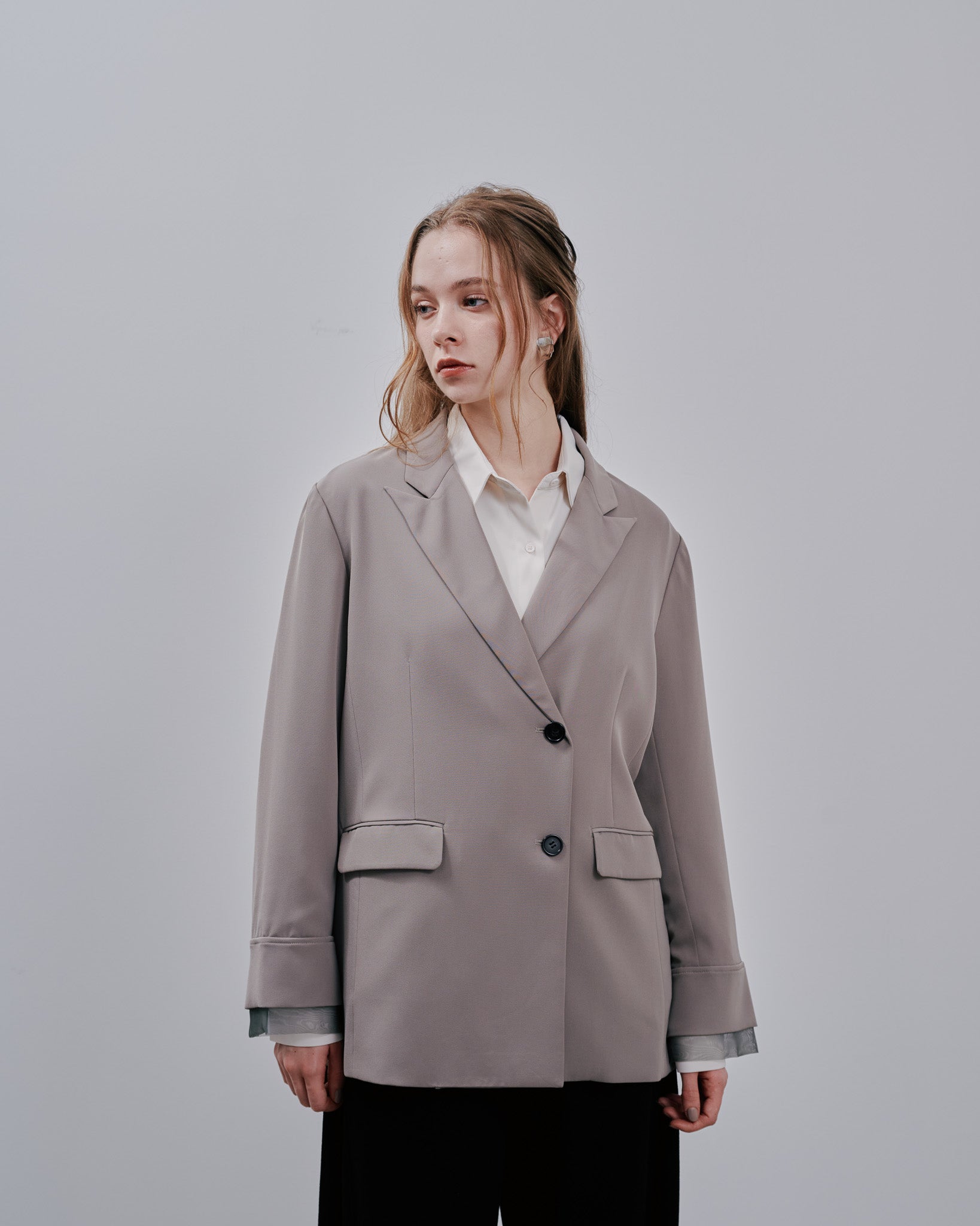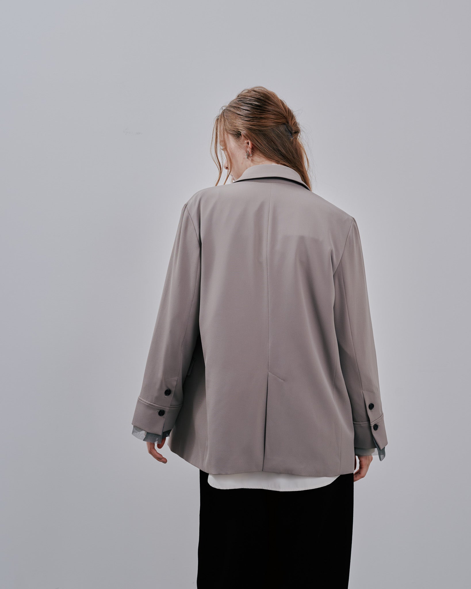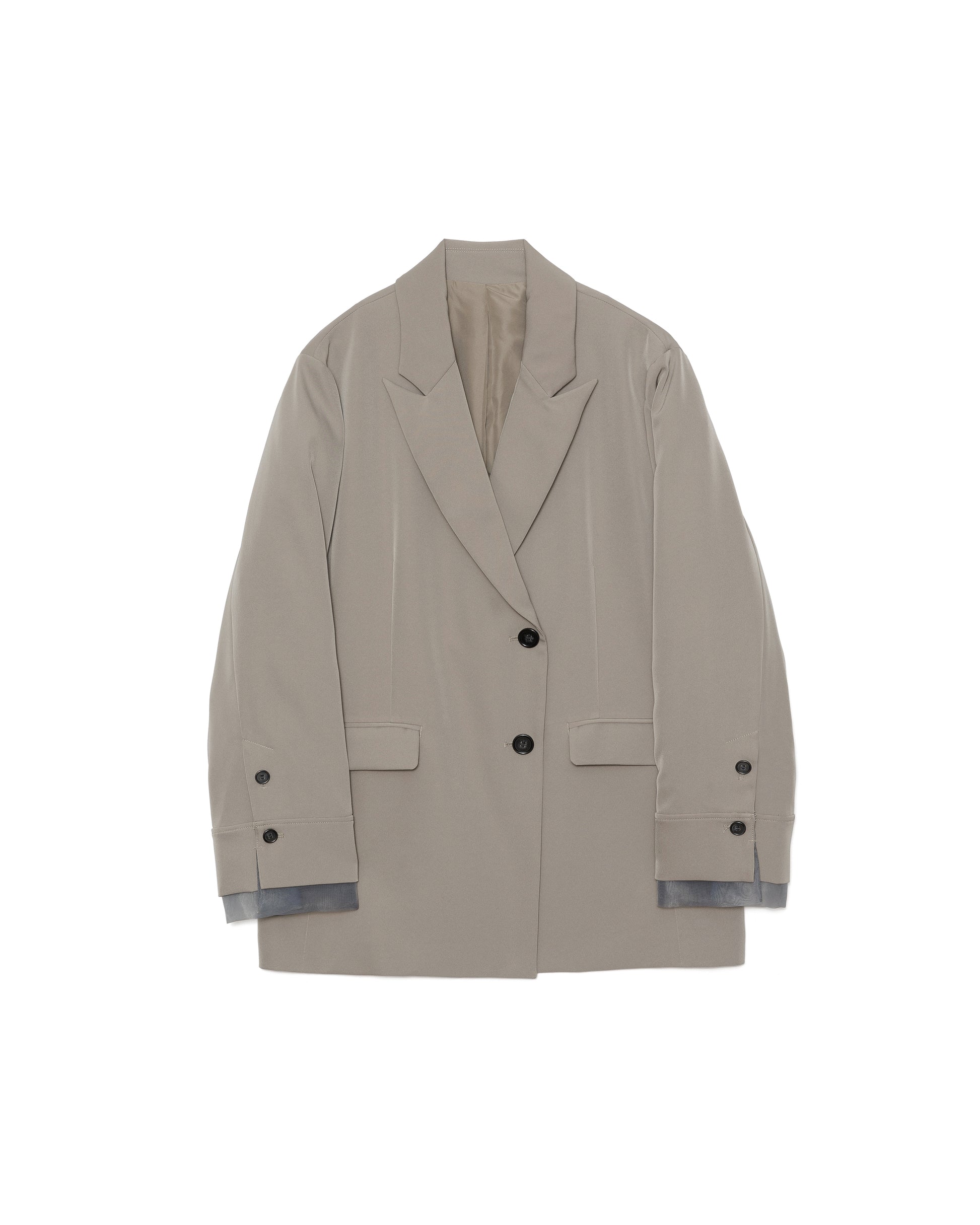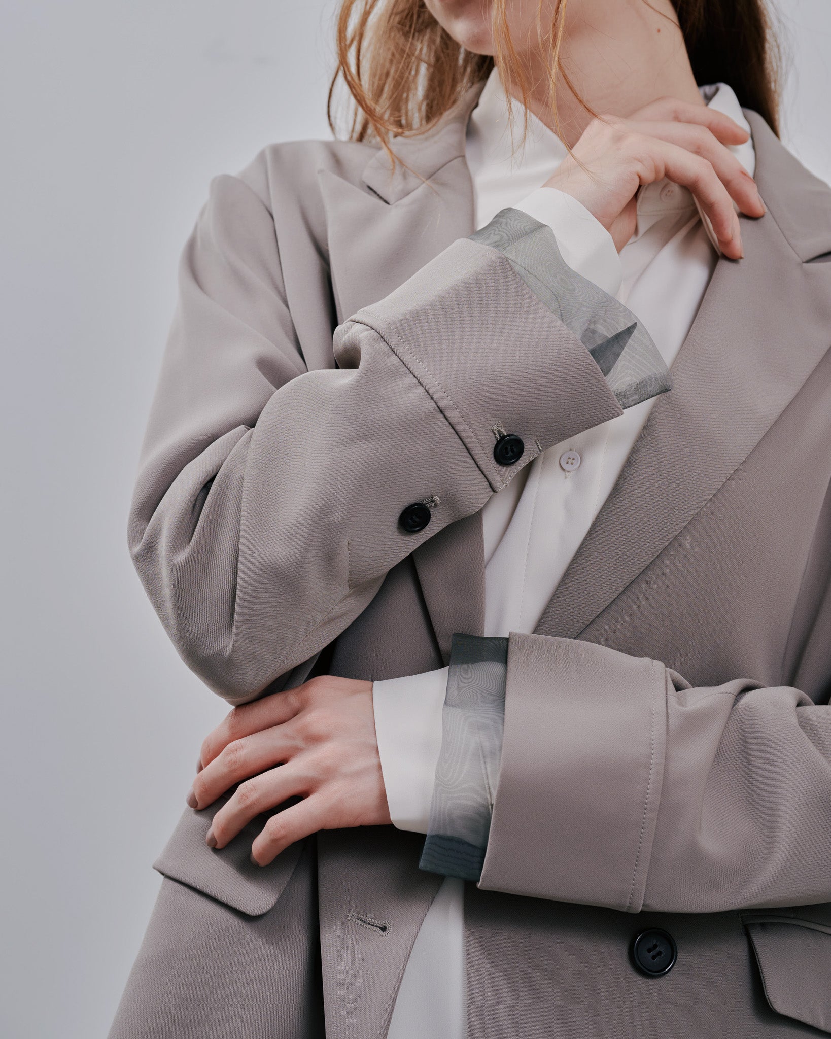 クラシカルなダブルジャケット。ルーズなサイジングながらも女性らしいシェイプを効かせたシルエット。袖にはシアー生地をレイヤードさせたデザインもポイント。