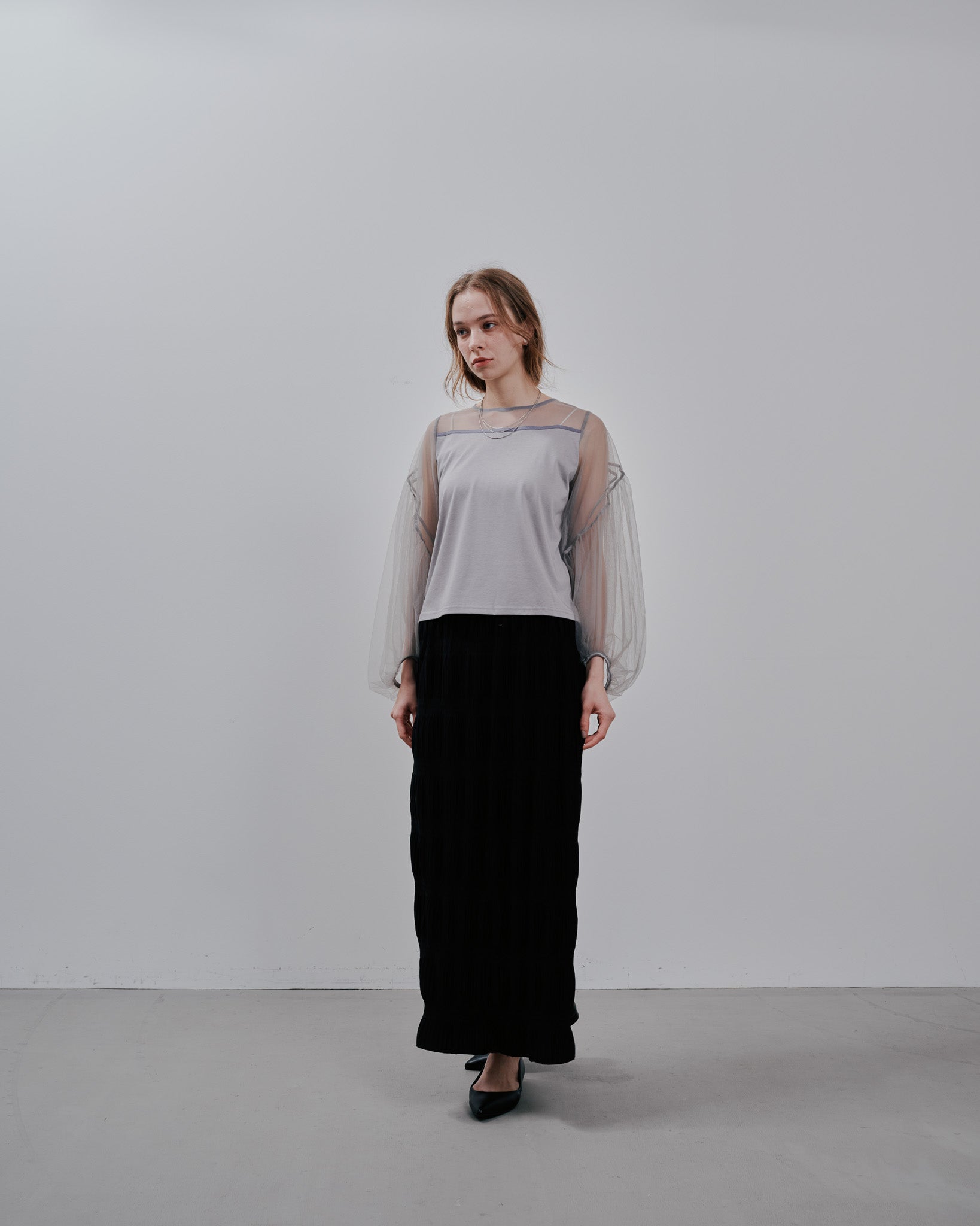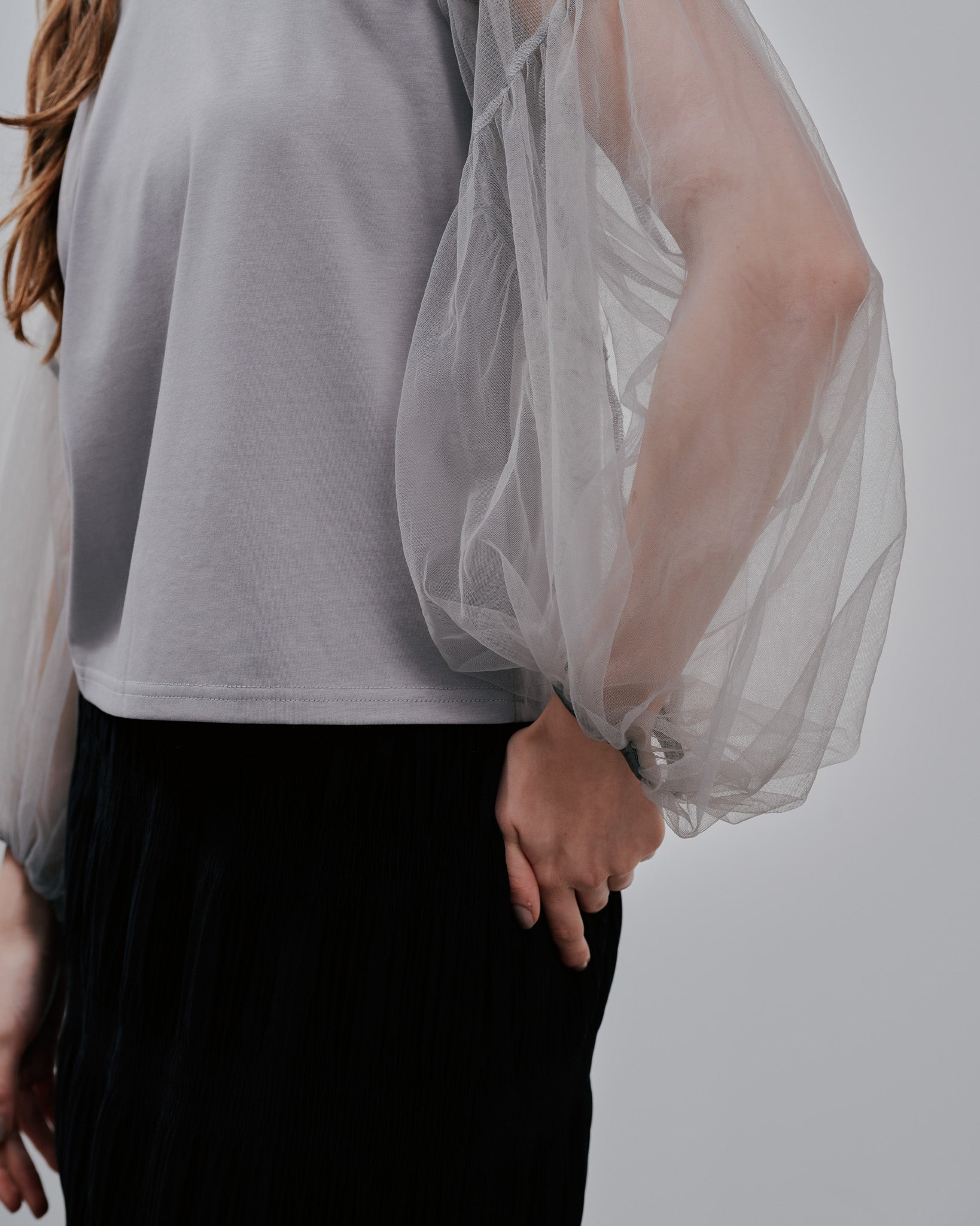 ボディは滑らかなレーヨン混素材を採用、袖にチュール素材を施したトップスです。ストレスなく着用いただけます。