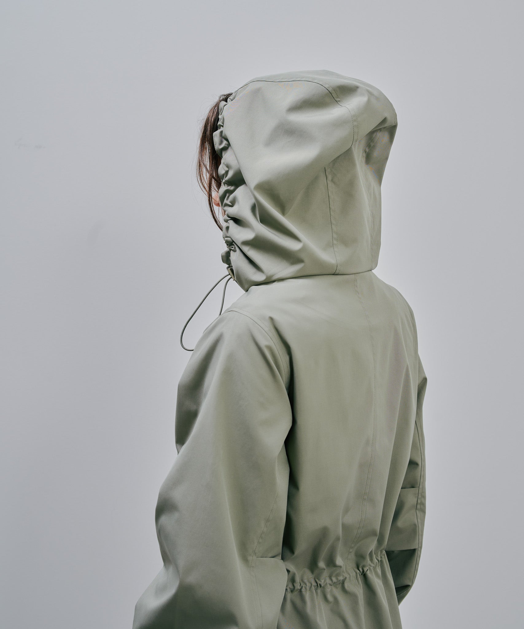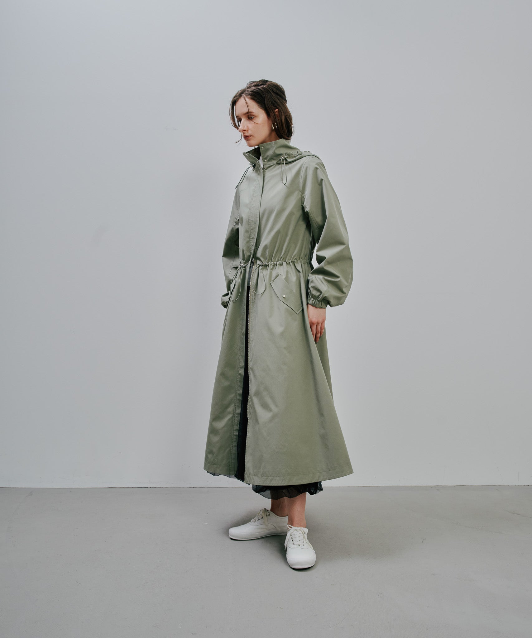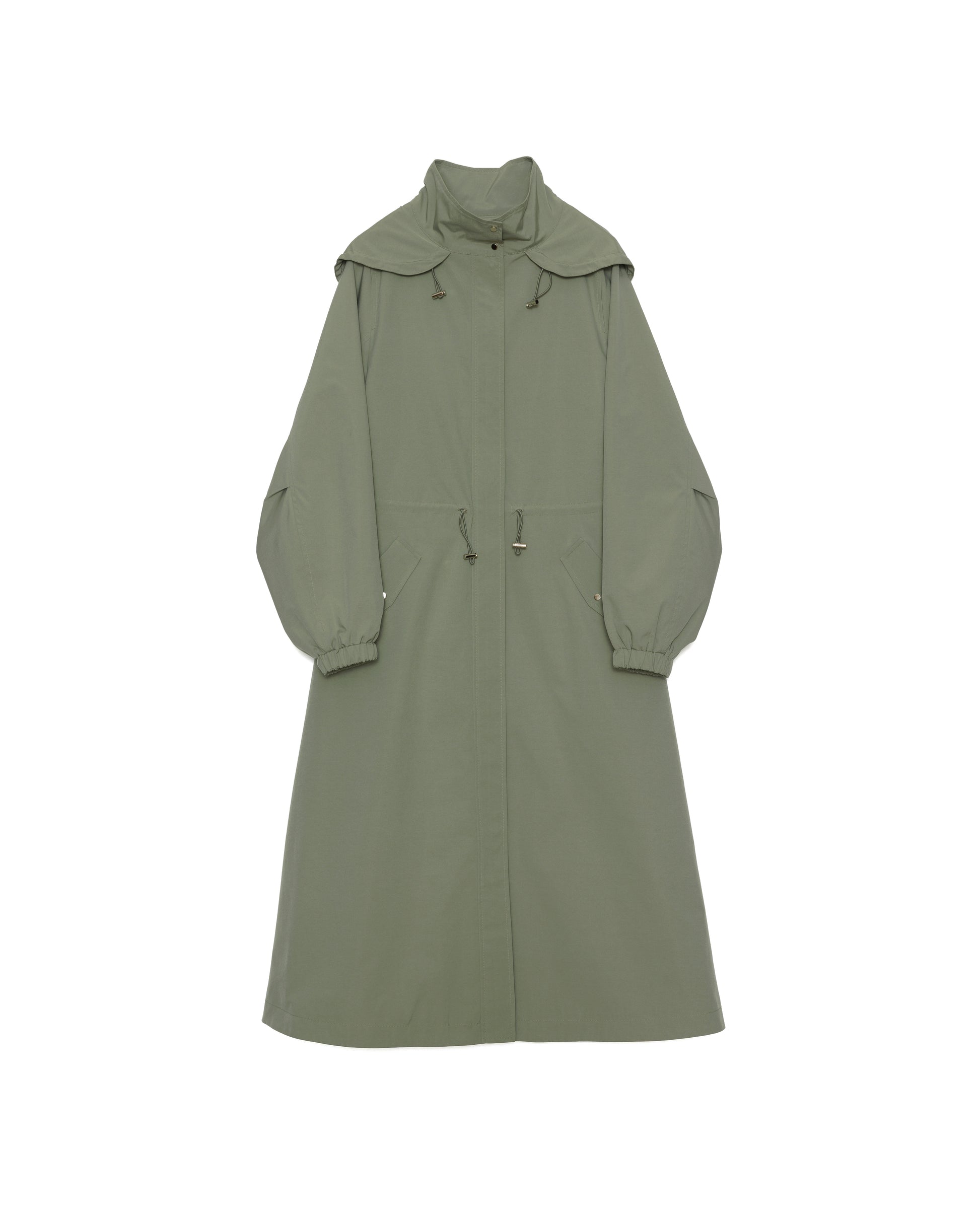 ミリタリーのジップアップコートをベースとしたロングコート。実用性のあるフードにウエストのドローコード。フラップはダミーでスムーズにポケットをお使いいただける。