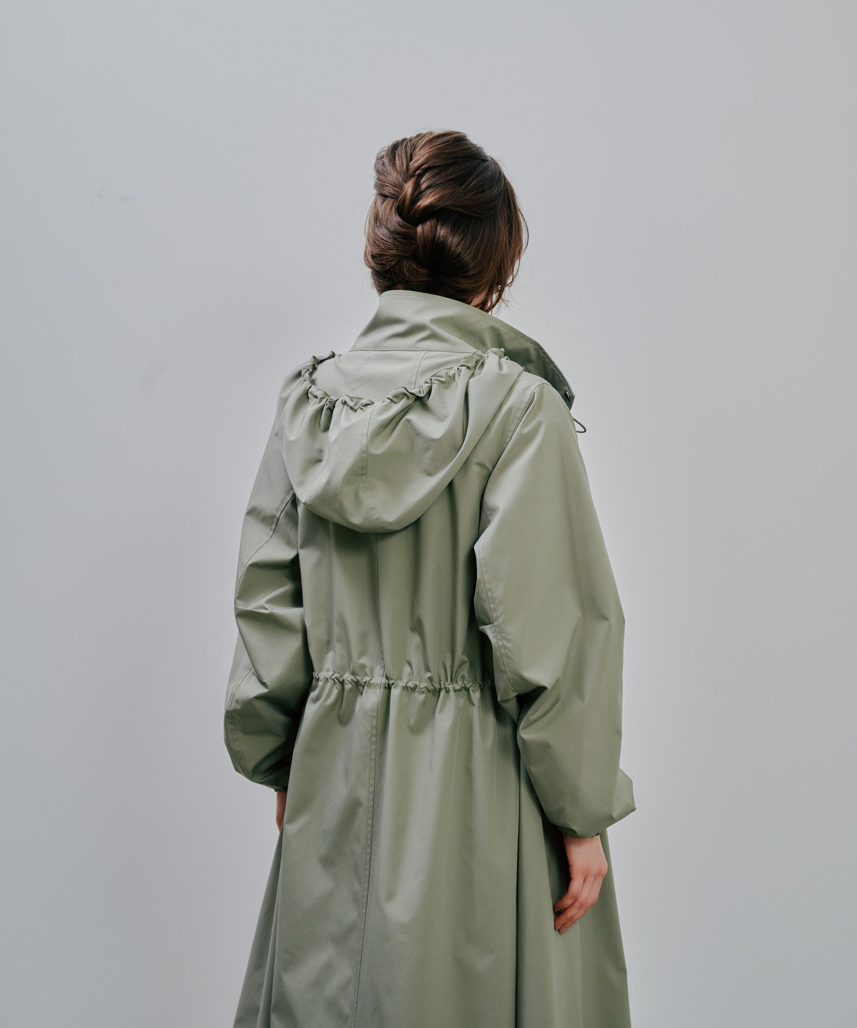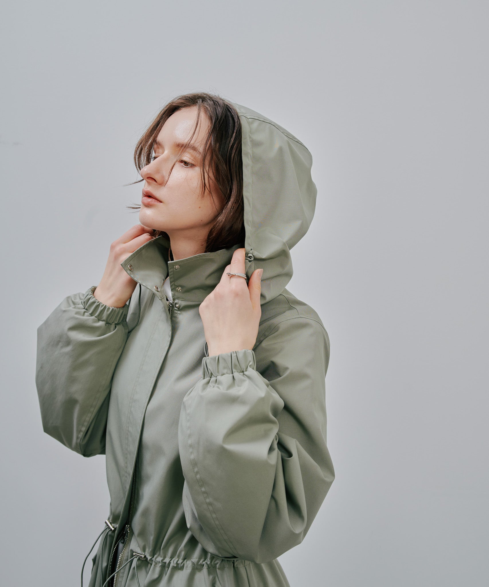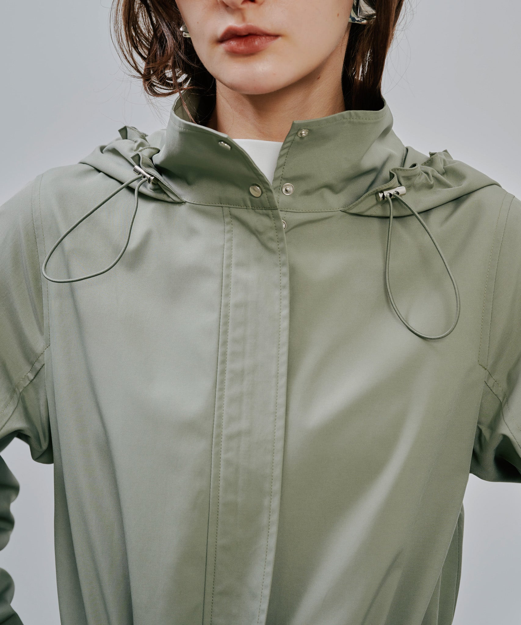 ミリタリーのジップアップコートをベースとしたロングコート。実用性のあるフードにウエストのドローコード。フラップはダミーでスムーズにポケットをお使いいただける。