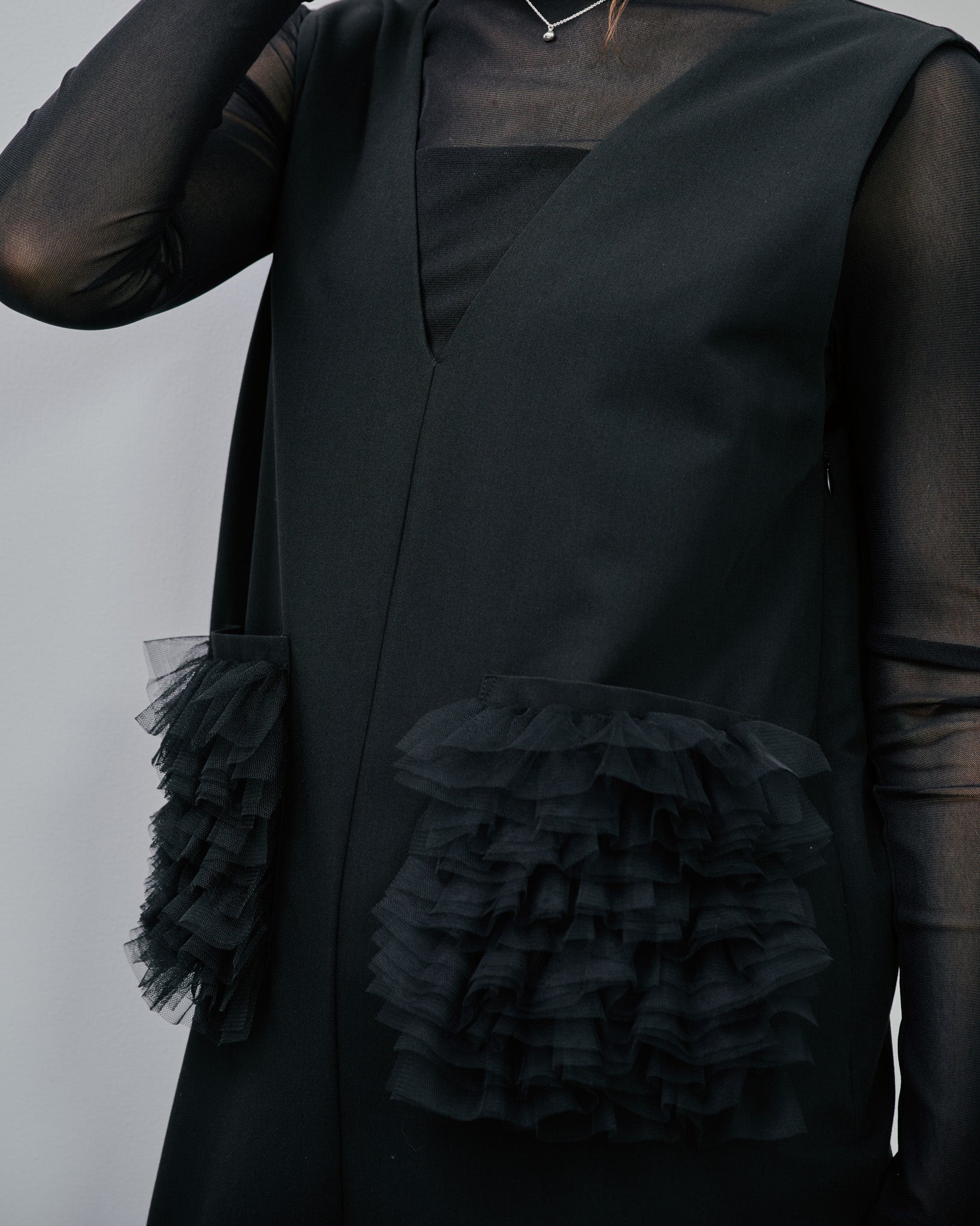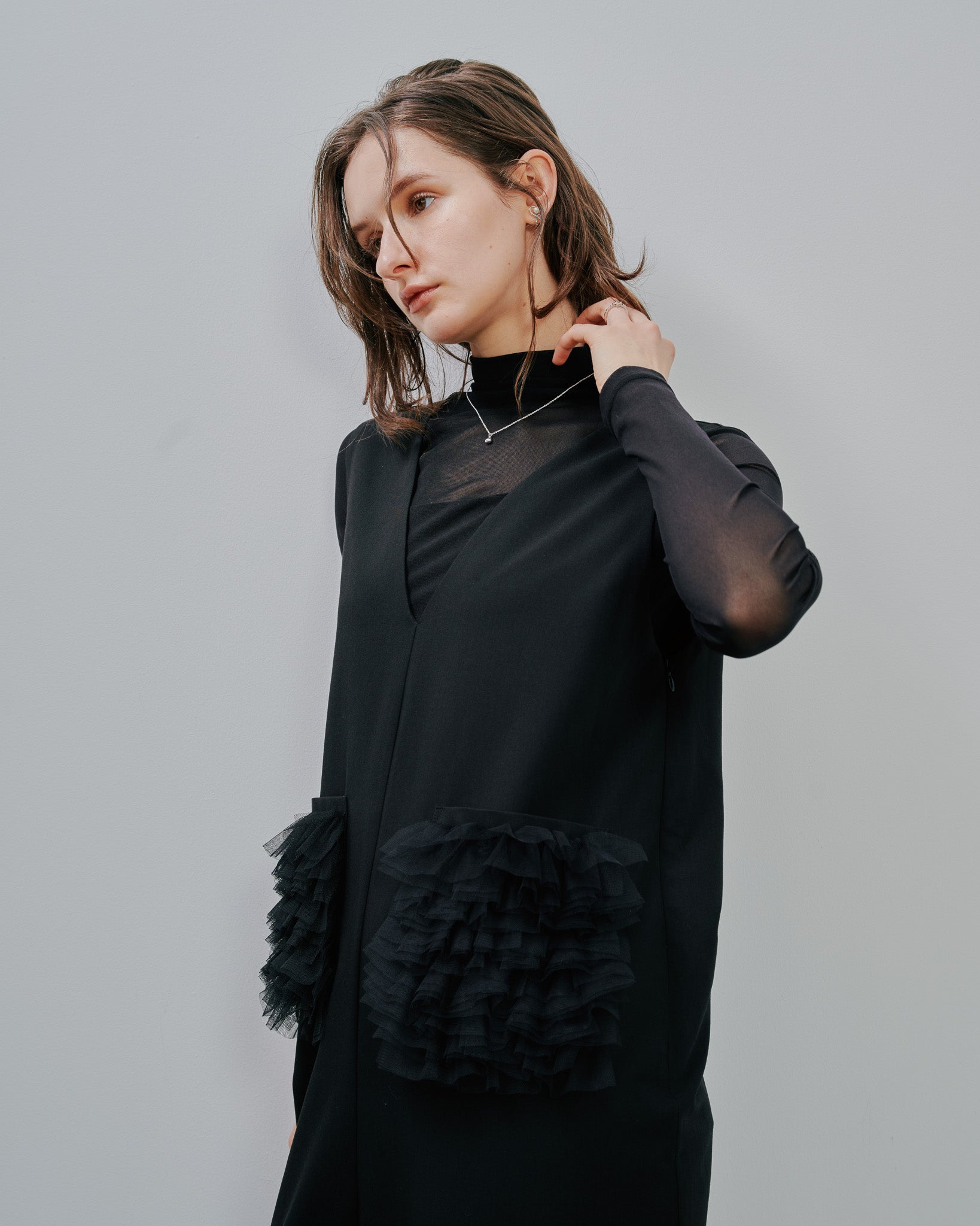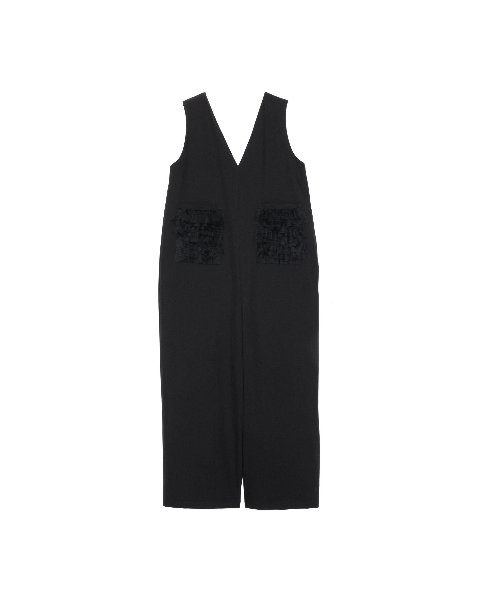 ポケットのチュールフリルが、旬のアクセントなロンパース。ワンピース感覚で大人っぽく着られるように、生地感やチュールのフリルに拘った1枚。ポケットのチュールは二重使いで、ボリューム感ある贅沢な仕上がりに!